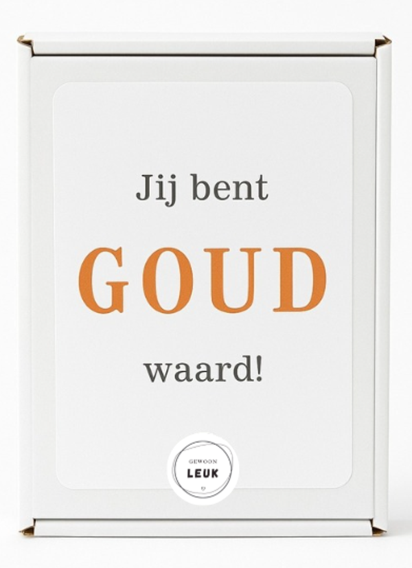 Op zoek naar en origineel, lief en stijlvol cadeautje om iemand te laten weten hoe bijzonder hij of zij is? Het 'Jij bent GOUD waard!' cadeaupakketje is precies wat je nodig hebt! Dit leuke cadeaudoosje bevat: